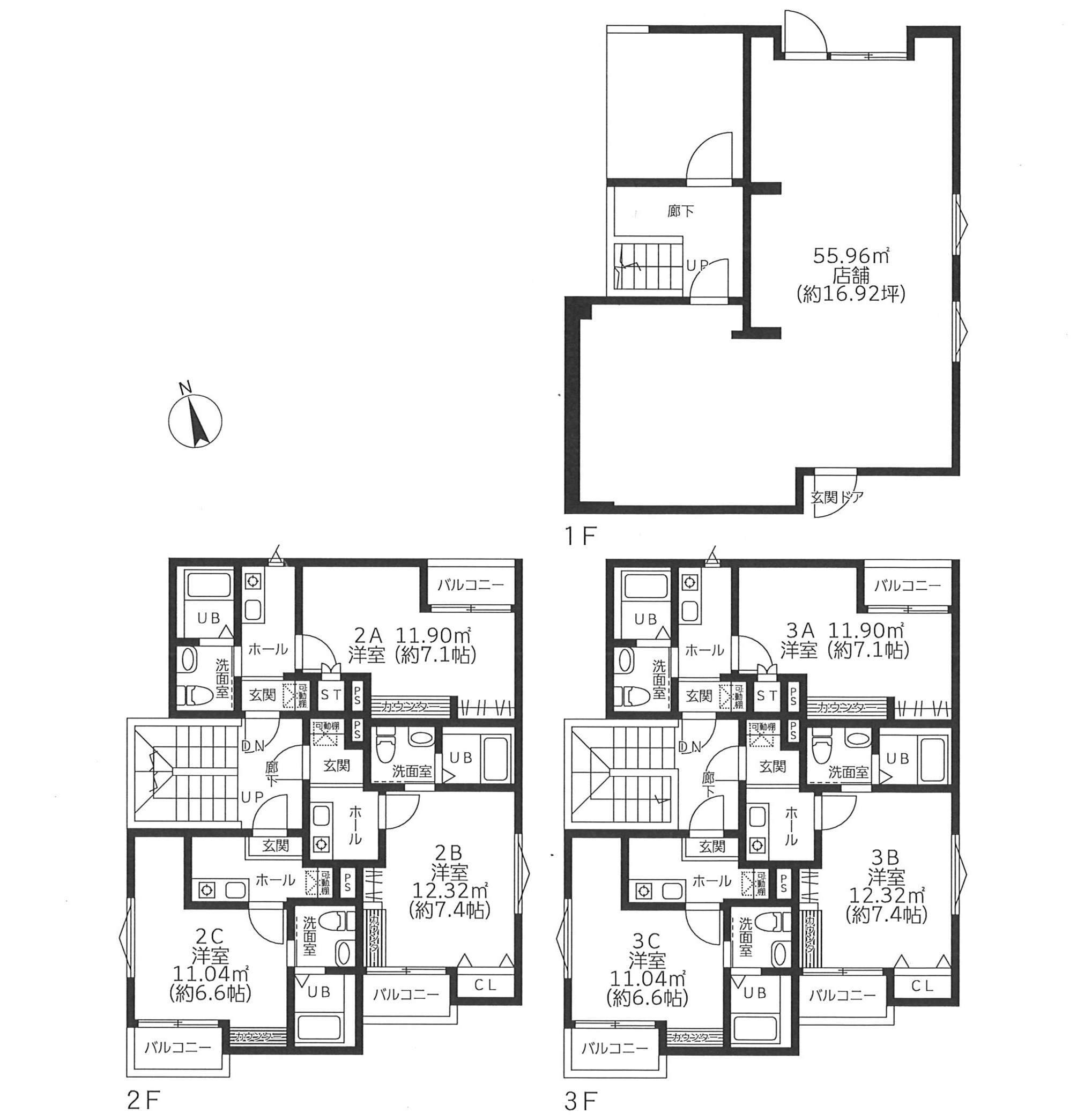 | 備考 | 1階 店舗 2階 1K ×3部屋 3階 1K ×3部屋 住宅性能評価取得 ・耐震等級3 ・耐風等級2 ・劣化対策等級3 ・断熱性能等級6 ・一次エネルギー消費量等級6 住宅部分 専有部分 A室 約21.5u(6.5坪) B室 約21.78u(6.5坪) C室 約19.94u(6.0坪) |
